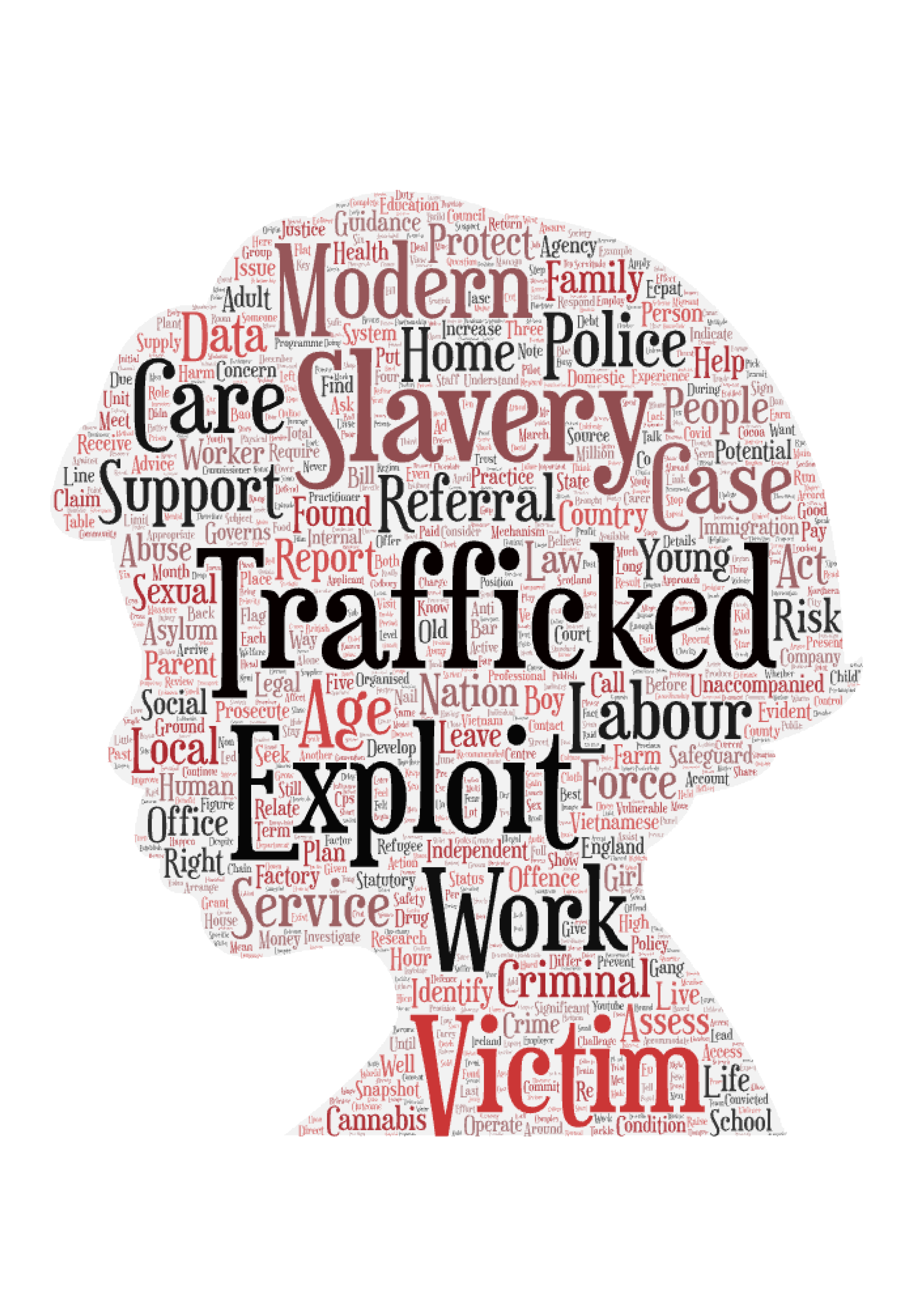 Why are “Trafficking” and “Slavery” the most frequent words? Our research has revealed that many illegal groups smuggle and traffic children from poor areas into the UK where they are enslaved and forced to work. Even though the laws protecting child labour in the UK are well established, many people take the risk of illegally employing children in factories and small businesses, causing great harm to children's development and psychological well-being(Guardian, 2017)(Independent Anti-Slavery Commissioner, 2021).
