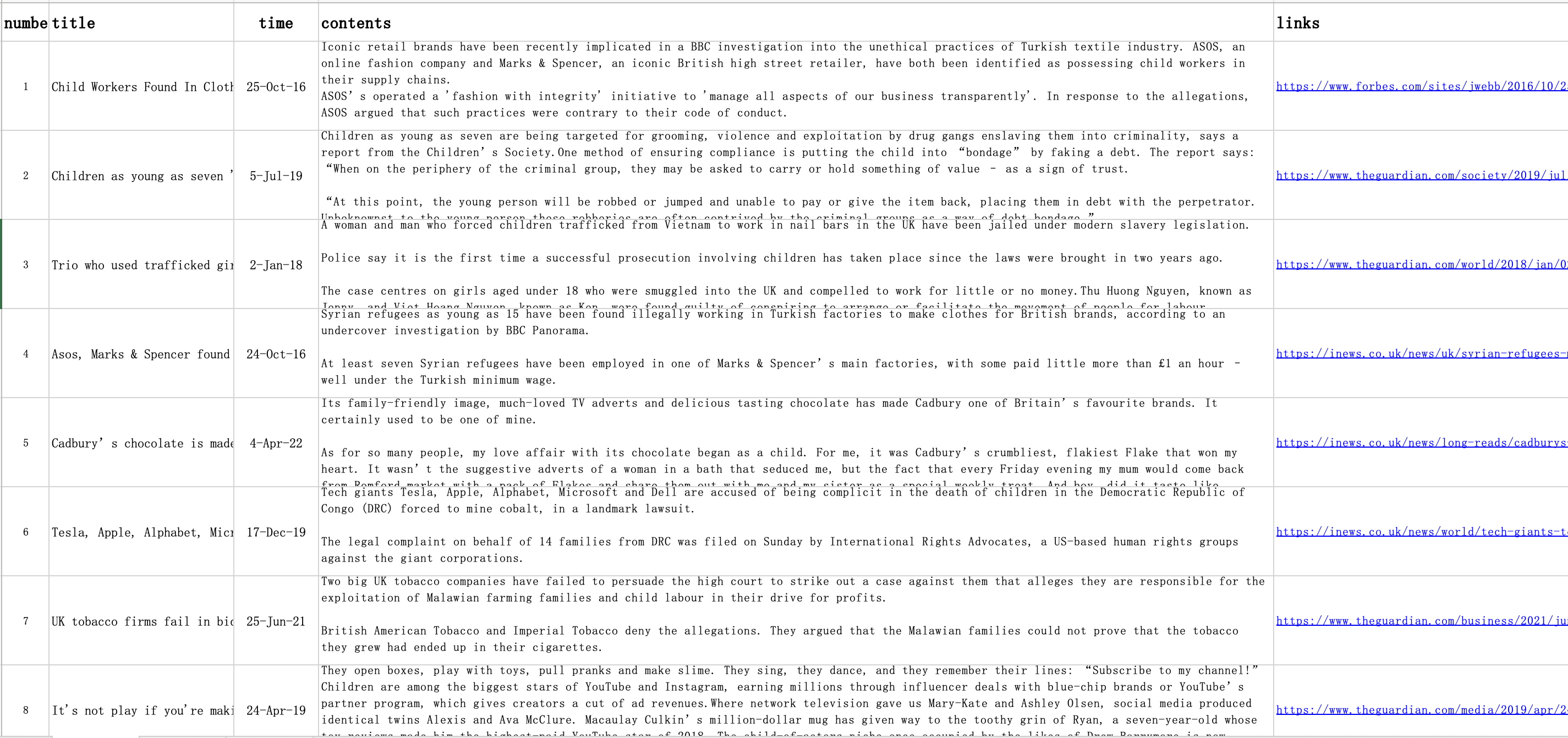 We searched for the keywords “UK” and “Child labour” and collected 20 news articles and cases related to child labour in the UK on the website, generating an image through a word cloud.